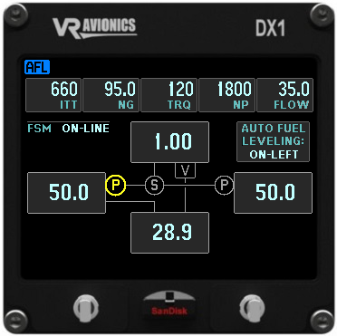 Should you team the FSM up with our DX1 display, the cockpit crew will get a dedicated page with a graphical representation of the fuel layout as well as current situation, as examples of are shown below.